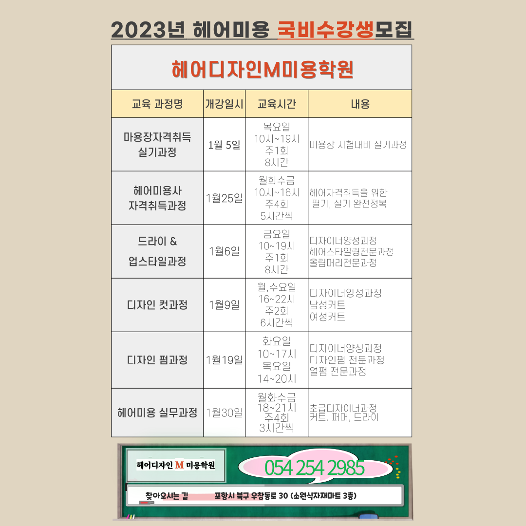 헤어미용사 자격취득과정 4개월과정 23년 1월 25일 개강
